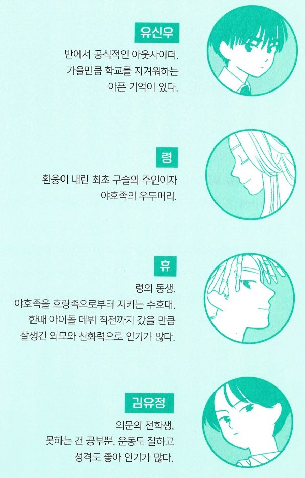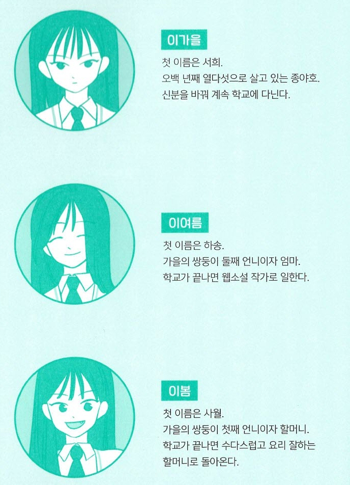 가을네 삼대 모녀가 야호로 산 지 꼭 오백 년이 되는 해 이들은 한 학교에 전학을 옵니다. 이들의 정체는 종야호로 야호족의 우두머리 령에 의해 야호가 된 사람들이죠. 나이순대로 할머니는 봄, 어머니는 여름, 주인공은 가을이라는 새로운 이름을 가지고 이번 대의 삶을 살아갑니다.
