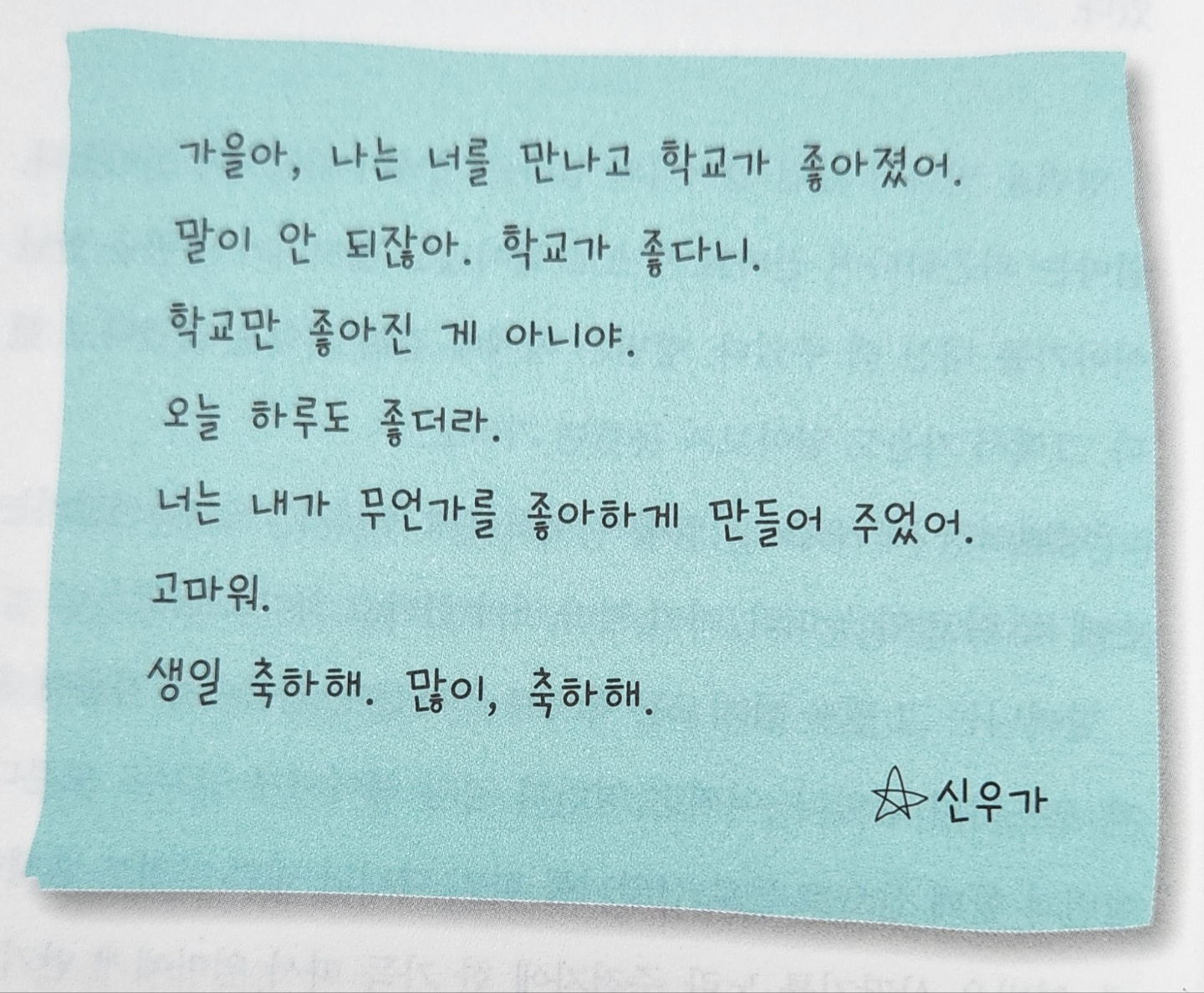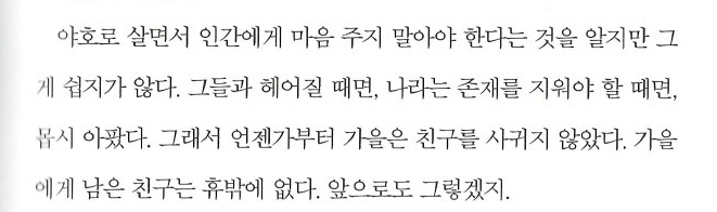하지만 돌이켜보면 같은 삶은 없었고 새로운 인연을 만나 새로운 삶을 시작할 수 있듯, 긍정적 마음을 가지고 앞으로 나아갈 수 있는 것이 아닐까요. 소설 속에서 가을을 좋아하고 그녀를 절대적으로 믿어주는 짝 신우에게 마음을 열게 되고 진정한 우정과 사랑을 나누듯 말이죠.